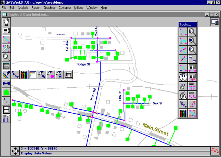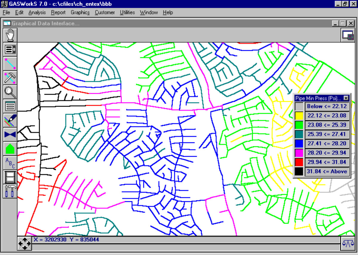GDI ile tüm değerler açılan pencerelerden izlenip değiştirilebilir. Çeşitli borular, düğüm noktası ve müşteri dataları içerikleri ekranda eklenebilir, silinebilir veya değiştirilebilir. Kullanıcının istediği yere yaklaşma, istediği oranda yaklaşma ve önceki görünüşe geçme gibi farklı resme yaklaşım (zoom) komutları ile model görüntüsü rahatça izlenebilir. Geniş bir renk paletine sahip renk kodlarıyla oluşturulan görüntü kullanıcının grafiksel olarak analiz sonuçlarını değerlendirme yeteneğini geliştirir ve sistemin performansını artırır. İzleme ve düzenleme algoritması bizim “Vana noktaları” dediğimiz özellik olarak acil olarak izole edilecek bölgelerin dizaynı için eklenmiştir. Kullanıcının model grafiğine eklemek istediği noktalar ve referanslar için tanımlama ve açıklama araçları sağlanmıştır.