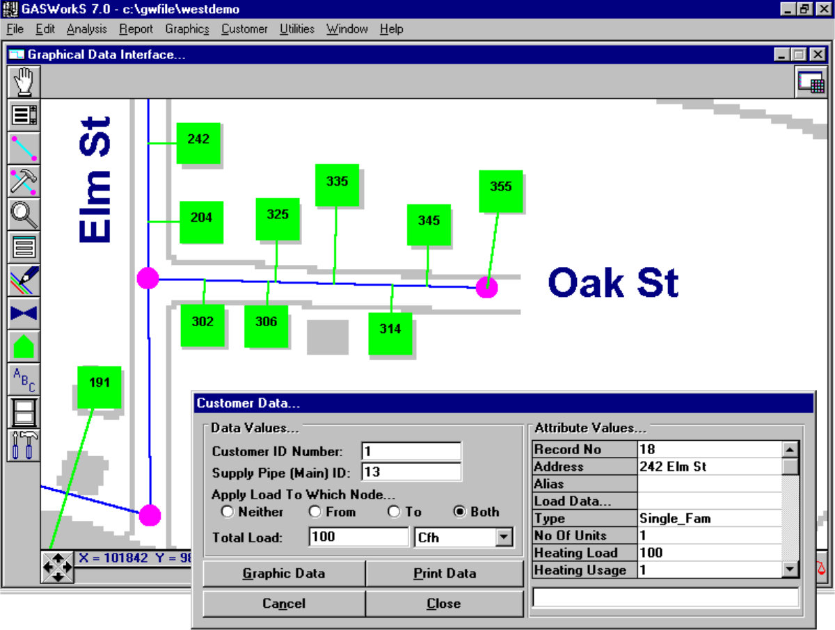 Anten veya İskelet tipindeki şebekeler de yükler İngiliz IGE yönetmeliklerine uygun olarak otomatik olarak dağıtılabilirler. İstenirse dışarıdan bir veri tabanı da GASWorkS müşteri verilerine eklenebilir. Bu özellikle faturalama verilerini model verilerine bağlamak için yararlıdır.