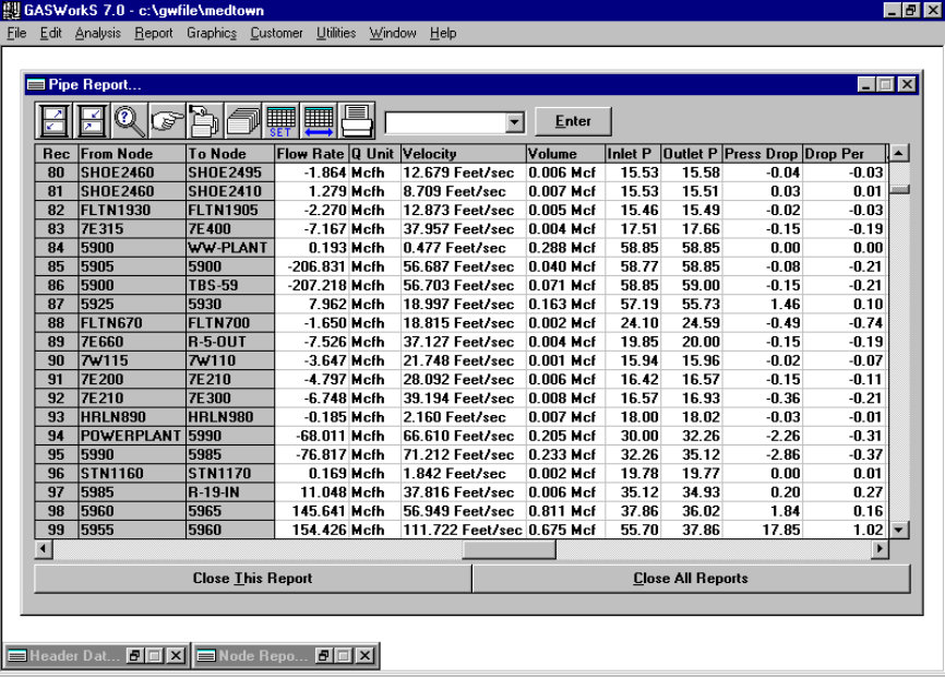 GASWorkS regülatörler için vana katsayısını ve kompresörler için kullanılan enerjiyi ve yakıt gereksinimini hesaplar. Modeldeki boruların boyutlarını tasarlamak için boru boyutlama fonksiyonu da sağlanmıştır.