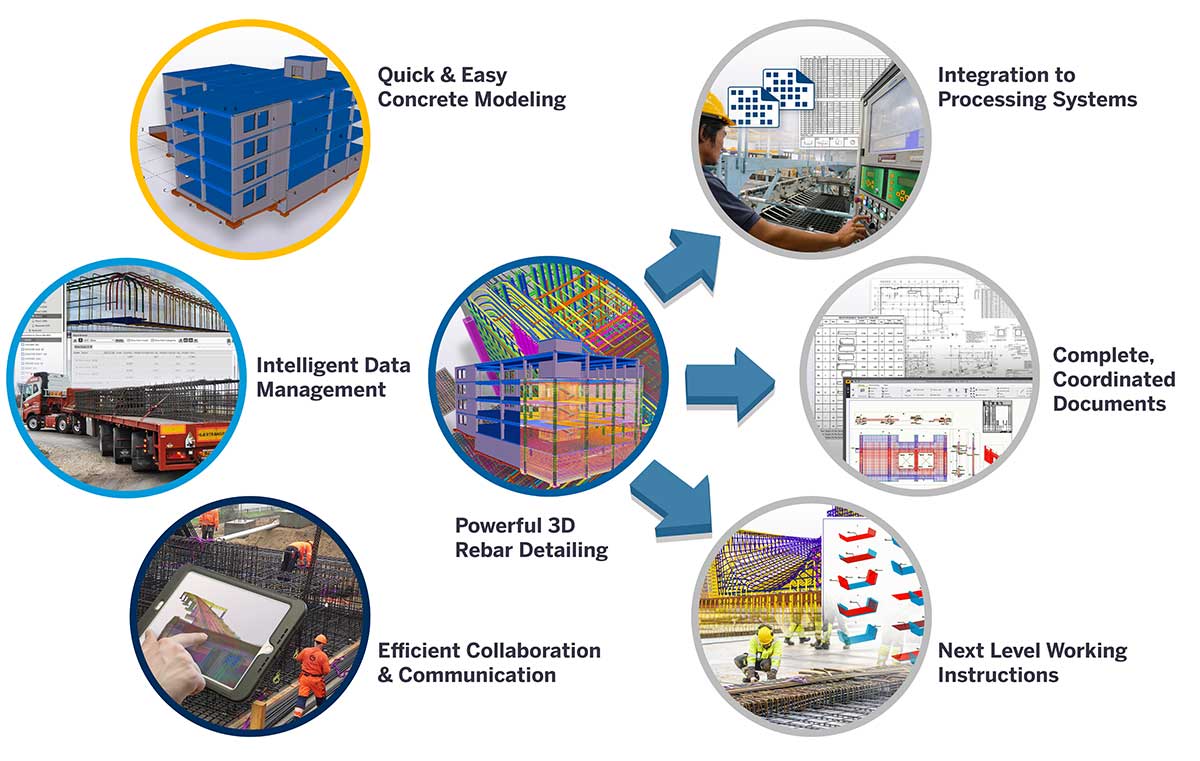 Betonarme konstrüksiyonun karmaşık ihtiyaçlarını karşılamak için tasarlanmış doğru, inşa edilebilir beton modelleri müteahhitlerin risklerini azaltmasına, ofiste ve sahada zaman tasarrufu sağlamasına ve sahada beton döküm verimliliğini arttırmasına olanak sağlar. Sağlanan güvenilir bilgi ve araçlar ile betonarme inşaat sürecini daha iyi planlayabilir ve yönetebilirsiniz.
