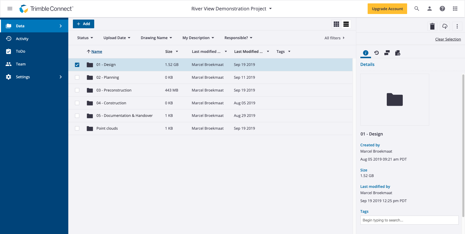Trimble Connect, verilerinizi güvenli bir şekilde, bulut tabanlı bir ortamda depolayıp, paylaşmanıza olanak sağlayarak, tüm dokümanlarınız için tek bir gerçek kaynak oluşturur. Böylece tedarik zinciri problemleri veya yüksek maliyetli yeniden üretime neden olabilecek sorunların ortadan kaldırılmasına olanak sağlar.